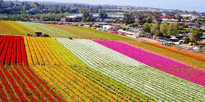 Another wonder: “What else is there to do besides admire ranunculus at The Flower Fields?” For starters, it’s fun to take a tractor-driven wagon ride around the property. In addition, the fields host a variety of fitness classes, wine tastings at sunset, flower arranging workshops, and music concerts. One can also sluice mine for gemstones or get lost in the sweet pea maze. There’s a playground, orchid greenhouse, exotic bird aviary, poinsettia display, a “sea of sunflowers,” and a huge American flag made of flowers. There is a live butterfly encounter and a glass butterfly art exhibit. Each week features a different rotating “pop-up” market, offering produce, gifts, and knickknacks. It’s a popular venue for weddings, graduations, and corporate and private events. Many food choices are available — from ice cream to coffee to tacos to pizza (need I say more?). The Flower Fields’ activity calendar can be found at https://www.theflowerfields.com/activities/